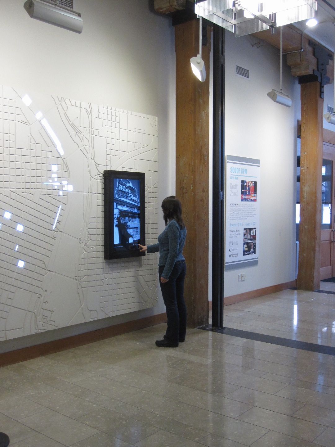 The installation highlights the geographic impact of the brothers’ work as a large city map with lighted city blocks. An interactive screen embedded into the map serves as a portal to dig deeper into the history within the map. Through the ‘portal,’ the user can filter through their projects based on four themes: Inventing the More Liable City, Raising the Stakes in Urban Redevelopment, Supporting Dignity and Prosperity for All, and the Oldtown Neighborhood Rejuvenation. At each project, the user can browse through historical photographs and artifacts from the Naito family archive.